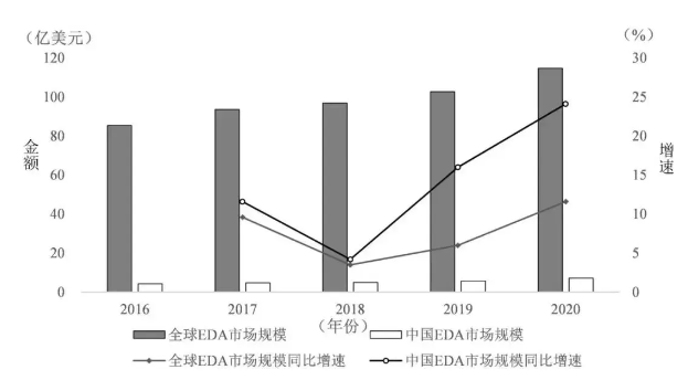圖3 2016—2020年EDA市場(chǎng)規(guī)模及增速比較