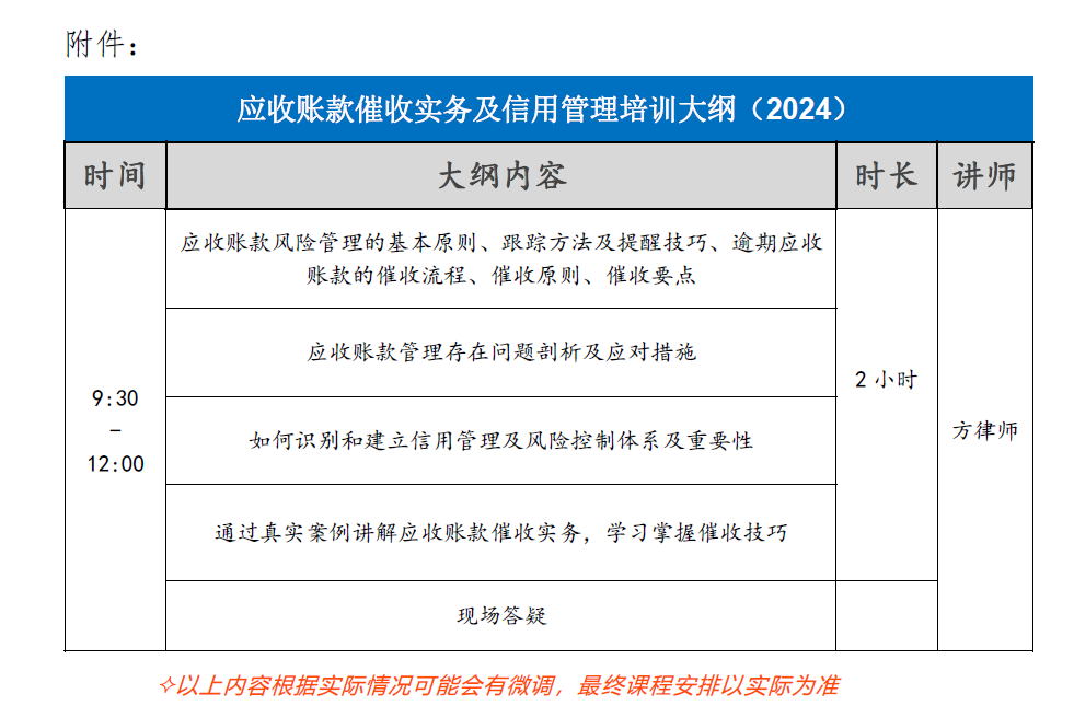 附件:應收賬款催收實務及信用管理培訓大綱(2024)