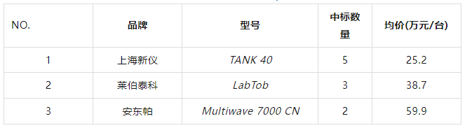 從中標數量來看,位居榜首的則是上海新儀,中標數量為7套;緊隨其后的是安東帕和上海屹堯,兩者均以5套的中標量并列第二名;萊伯泰科則以4套的中標量排在第三位;上海元析中標2套,其他各品牌分別中標1套。