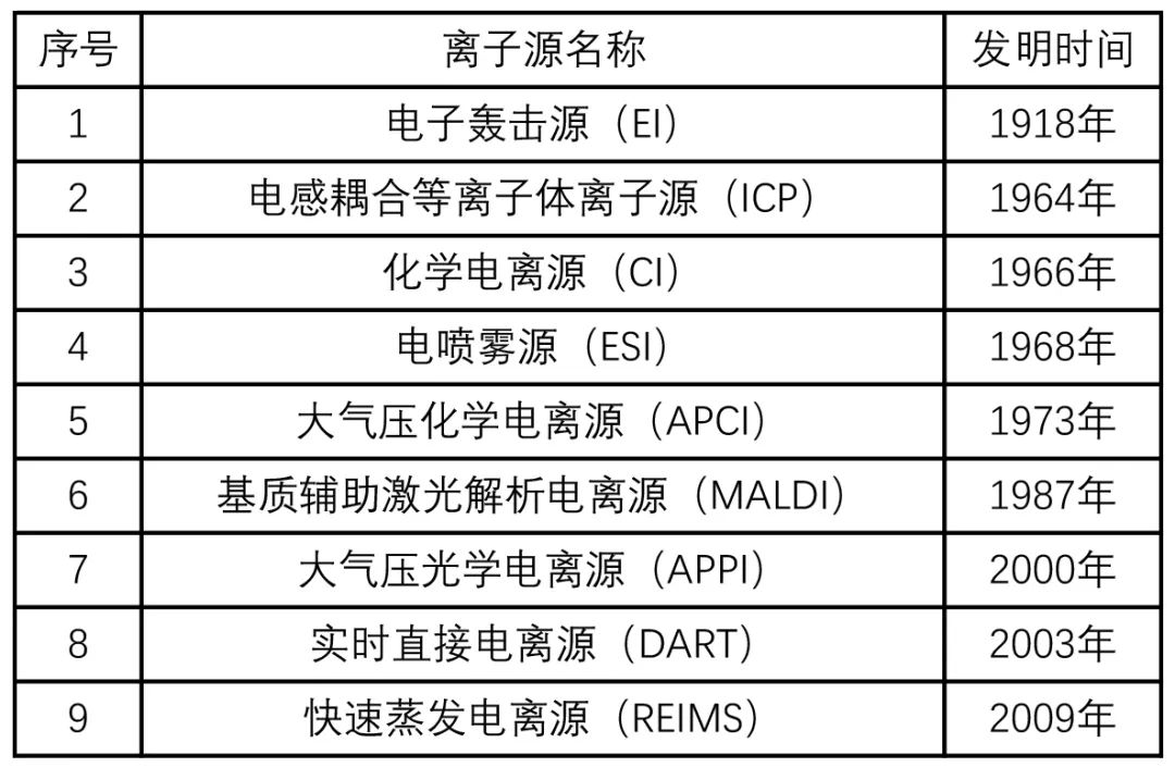 離子源將樣品中的分子或原子離子化,為質譜分析的核心過程提供關鍵離子來源。20世紀初,A.J. Dempster發明了電子轟擊源(EI),這一技術被視為離子源領域的開創性突破。1966年,產生了化學電離(CI)方法,上世紀八十年代,電噴霧電離(ESI)技術以及基質輔助激光解吸電離[10]MALDI)技術發明,并廣泛應用于生物醫學和生物質譜學領域,引領了質譜技術的新發展方向。大氣壓光學電離源(APPI)技術為難溶解或揮發性較低的樣品提供了有效的離子化方法,實時直接電離源(DART[11]的問世使得質譜分析更加快速便捷。2009年,快速蒸發電離源(REIMS)技術的發明,進一步提高了樣品的分析速度和準確性,為臨床醫學等領域帶來了革命性的變革(表2)。總之,離子源技術的創新和升級為質譜技術提供了更廣泛的應用選擇。