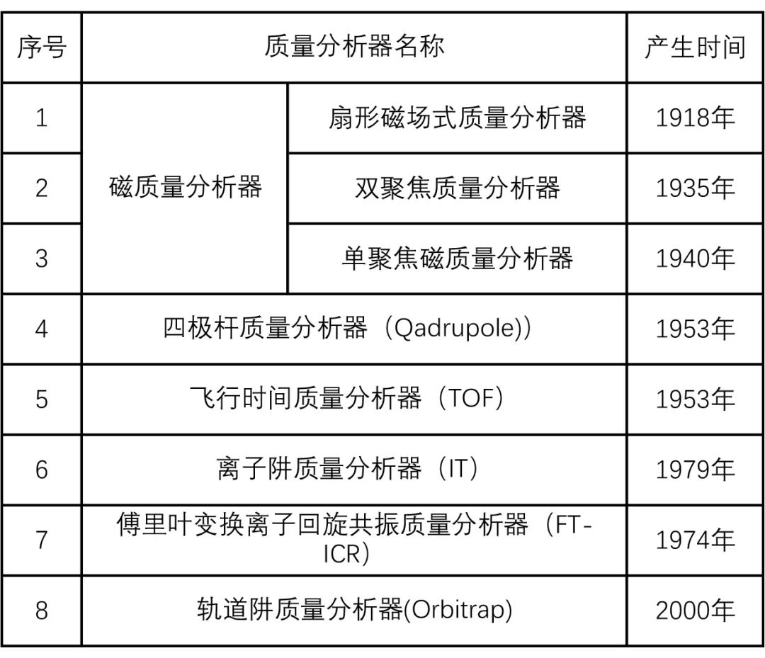 質量分析器用于測量離子的質量和電荷比(m/z),是質譜儀器最為關鍵的組件。扇形磁場式質量分析器于1918年問世。1953年,四極桿質量分析器(Quadrupole)發明,并迅速成為廣泛應用于各類質譜儀的核心組件之一。飛行時間質量分析器(TOF),使離子飛行時間成為測定質量的有效手段,在高分辨率和高精確度的質譜分析中扮演著重要角色。1974年,傅里葉變換離子回旋共振質量分析器(FT-ICR)發明,質譜分析達到了歷史最高的分辨率水平。1979年,離子阱裝置出現,它具有捕獲、存儲和操控離子的能力。2000年,軌道阱質量分析器(Orbitrap)技術問世,引領了質譜儀器領域新的發展(表3)。