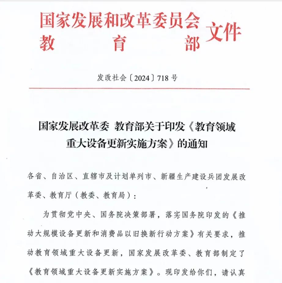 《教育領(lǐng)域重大設(shè)備更新實(shí)施方案》是為推動(dòng)教育領(lǐng)域的設(shè)備現(xiàn)代化,提升教學(xué)和科研水平,由國家發(fā)改委和教育部聯(lián)合印發(fā)。《教育領(lǐng)域重大設(shè)備更新實(shí)施方案》,明確了支持內(nèi)容、支持標(biāo)準(zhǔn)、遴選原則、申報(bào)要求以及保障措施。