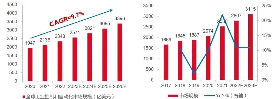 左圖:2020-2026E全球工控和自動化市場規(guī)模(億美元)