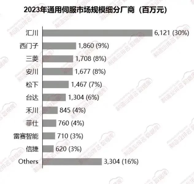 從2023年的銷售額數(shù)據(jù)來看,通用伺服市場呈現(xiàn)出較高的集中度,前五家廠商的市場份額超過60%。其中,匯川以30%的市場份額位居第一,領(lǐng)先于西門子、三菱等國際品牌。
