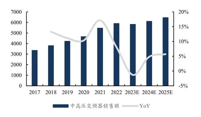 在中高壓變頻器市場中,2020年~2022年,我國中高壓變頻器市場規(guī)模同比增長率分別達(dá)到了10%、17%和8%,年復(fù)合增長率達(dá)到了13%,顯示出強勁的增長動力。