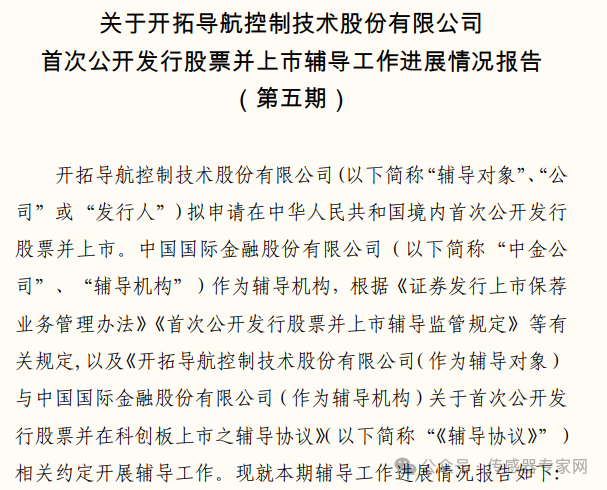 2023 4 28 日,開拓導航與中國國際金融股份有限公司簽署IPO輔導協議,截止2024719日,已完成第五期輔導工作。