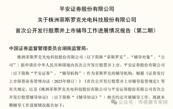 公告顯示平安證券股份有限公司已于2024125日與株洲菲斯羅克光電科技股份有限公司簽訂上市輔導協議,截止202478日,已完成第二期輔導工作。