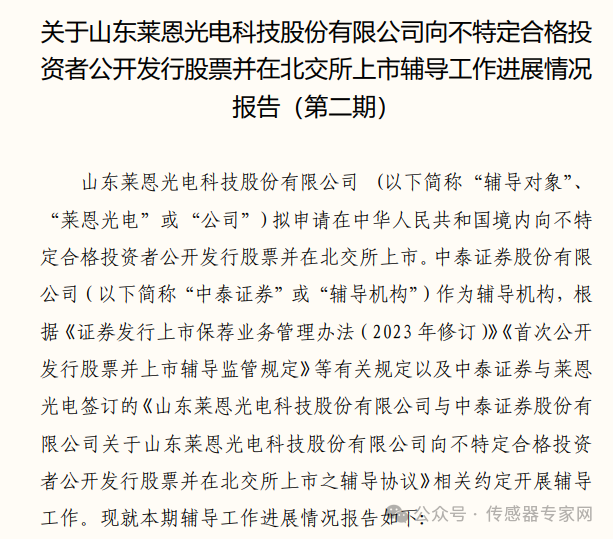 202312月,萊恩光電與中泰證券簽署上市輔導協議,截止202478日,已完成第二期輔導工作。