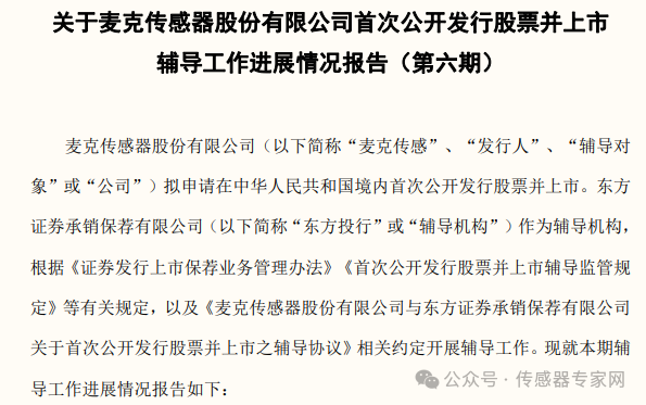 2023110日,麥克傳感與東方證券簽署上市輔導協議,截止2024710日,麥克傳感已完成第六期上市輔導工作。