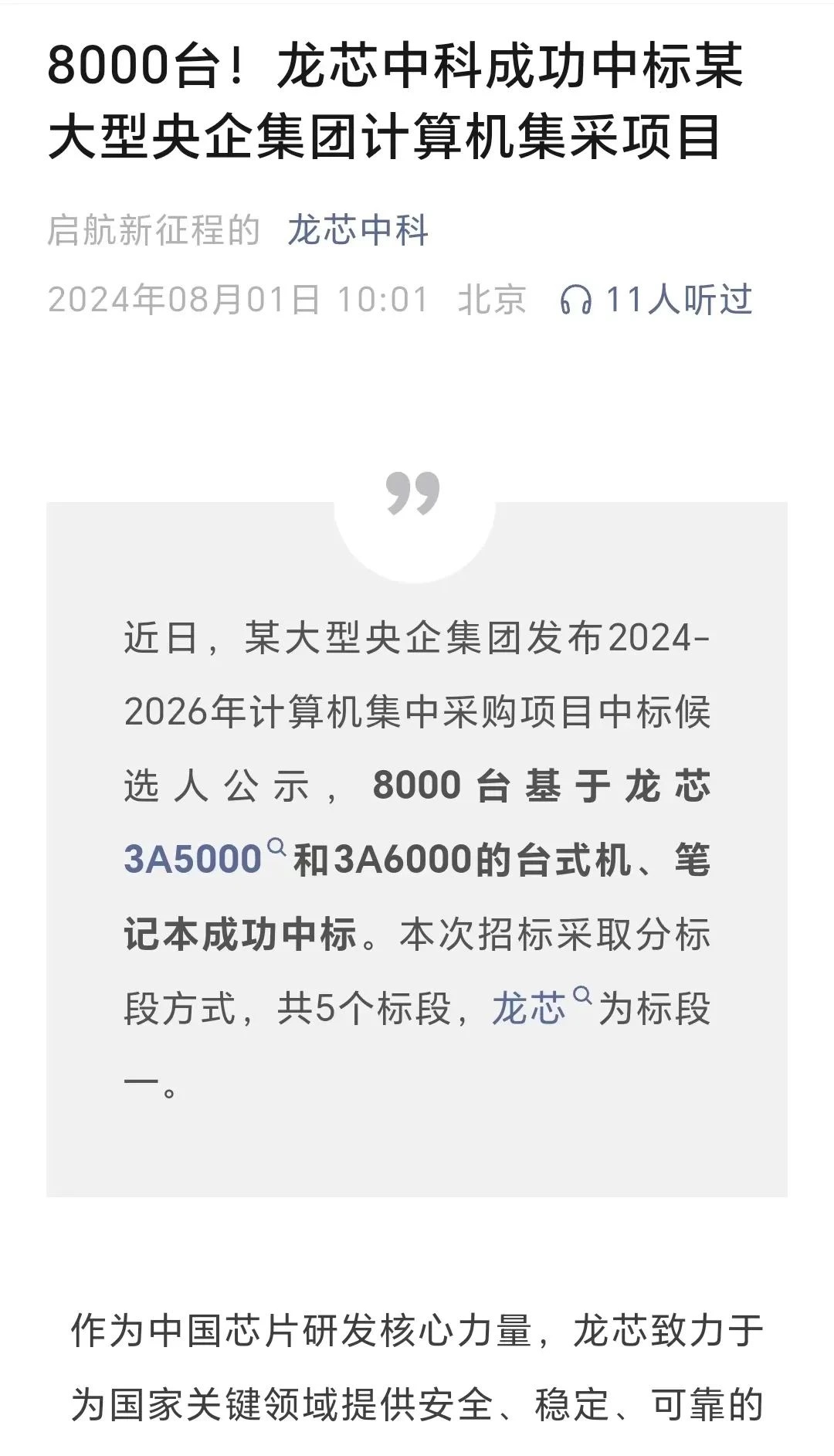 8月1日,龍芯中科在其官方微信公號中曾發文稱,近日,某大型央企集團發布2024年-2026年計算機集中采購項目中標候選人公示,8000臺基于龍芯3A5000和3A6000的臺式機、筆記本成功中標。本次招標采取分標段方式,共5個標段,龍芯為標段一。