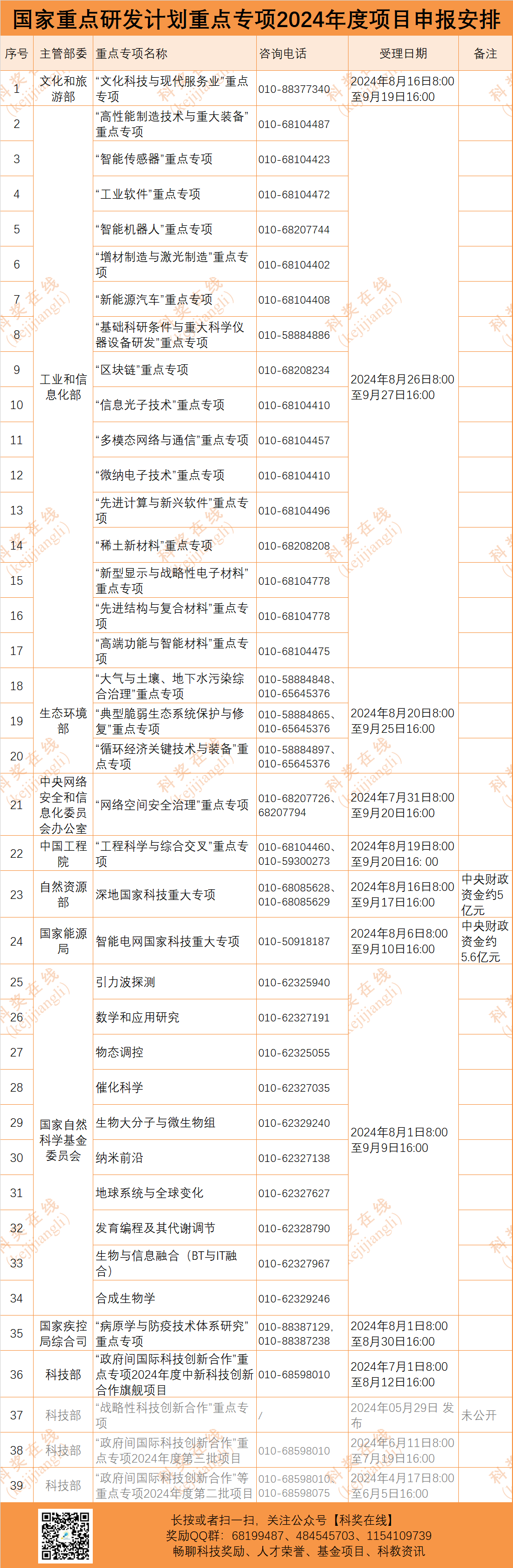 根據(jù)黨中央、國(guó)務(wù)院關(guān)于科技計(jì)劃管理改革的有關(guān)要求,國(guó)家重點(diǎn)研發(fā)計(jì)劃重點(diǎn)專項(xiàng)、國(guó)家科技重大專項(xiàng)主責(zé)單位由科技部調(diào)整至各部委。現(xiàn)將2024年度國(guó)家重點(diǎn)研發(fā)計(jì)劃申報(bào)安排匯總?cè)缦拢┐蠹覅⒖迹ň唧w以科技部官網(wǎng)消息為準(zhǔn))。