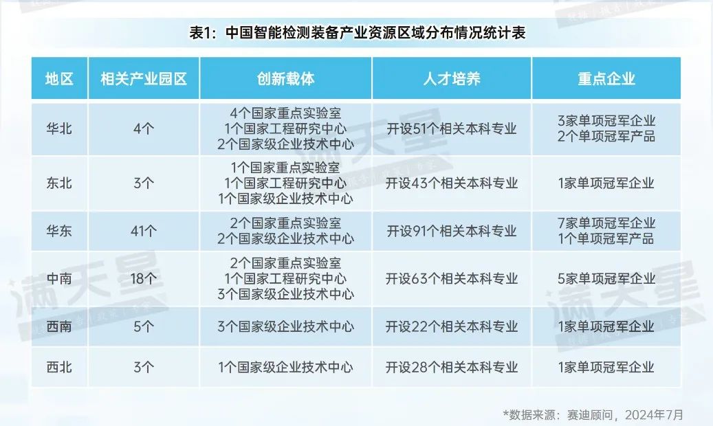 當前中國智能檢測裝備產業資源主要分布在華北、華東和中南地區。其中,華北地區產業創新及人才資源、共性平臺及裝置優勢突出,華東地區產業集聚和重點企業優勢突出,中南和西南地區則有一些特色資源分布、具備躍升發展的潛力。