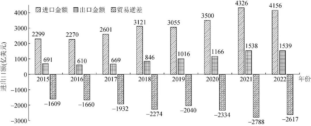 2022年中國集成電路的進出口量顯著下降,但進出口產品價值卻大幅提升。根據海關總署的數據顯示,2022年中國集成電路進口數量總額5384億塊,同比下降15.3%①;出口數量總額2734億塊,同比下降12%;貿易逆差2650億塊,同比下降18.4%。