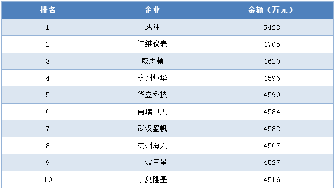 A級(jí)單相智能電能表中標(biāo)金額前十企業(yè)
