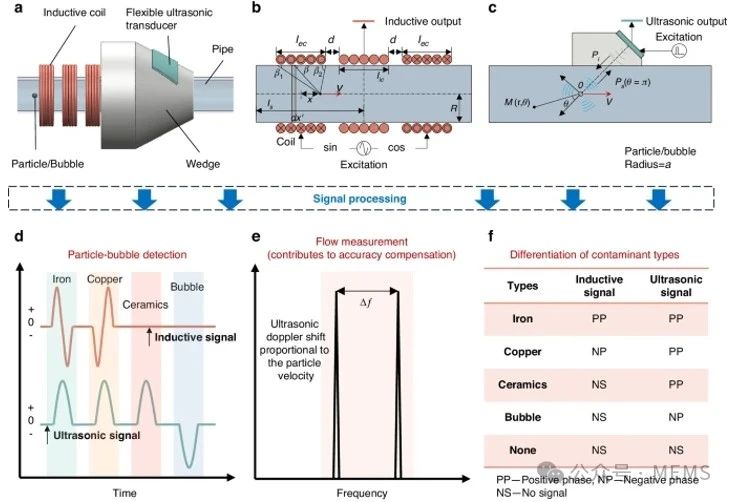 該方法在測量流速的同時能夠區分鐵磁性金屬顆粒、非鐵磁性金屬顆粒、非金屬顆粒和氣泡。微機械加工可以顯著減小傳感器的尺寸,而柔性襯底使安裝更加方便,增強聚焦聲場,從而提高檢測能力。這項研究成果已于近期發表在Microsystems & Nanoengineering期刊上。