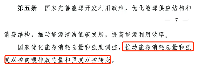 第五條:國家完善能源開發(fā)利用政策,優(yōu)化能源供應結構和消費結構,推動能源清潔低碳發(fā)展,提高能源利用效率。國家優(yōu)化能源消耗總量和強度調(diào)控,推動能源消耗總量和強度雙控向碳排放總量和強度雙控轉(zhuǎn)變。