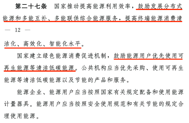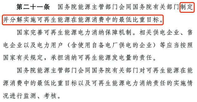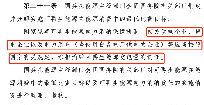 第二十一條:國家完善可再生能源電力消納保障機制。相關供電企業(yè)、售電企業(yè)以及電力用戶 (含使用自備電廠供電的企業(yè))等應當按照國家有關規(guī)定,承擔消納可再生能源發(fā)電量的責任。國務院能源主管部門會同國務院有關部門對可再生能源在能源消費中的最低比重目標以及可再生能源電力消納責任的實施情況進行監(jiān)測、考核。