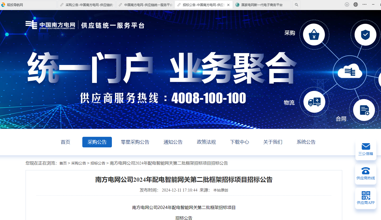 南方電網(wǎng)公司2024年配電智能網(wǎng)關(guān)第二批框架招標(biāo)項(xiàng)目招標(biāo)公告(項(xiàng)目編號(hào):CG2700022001951745)