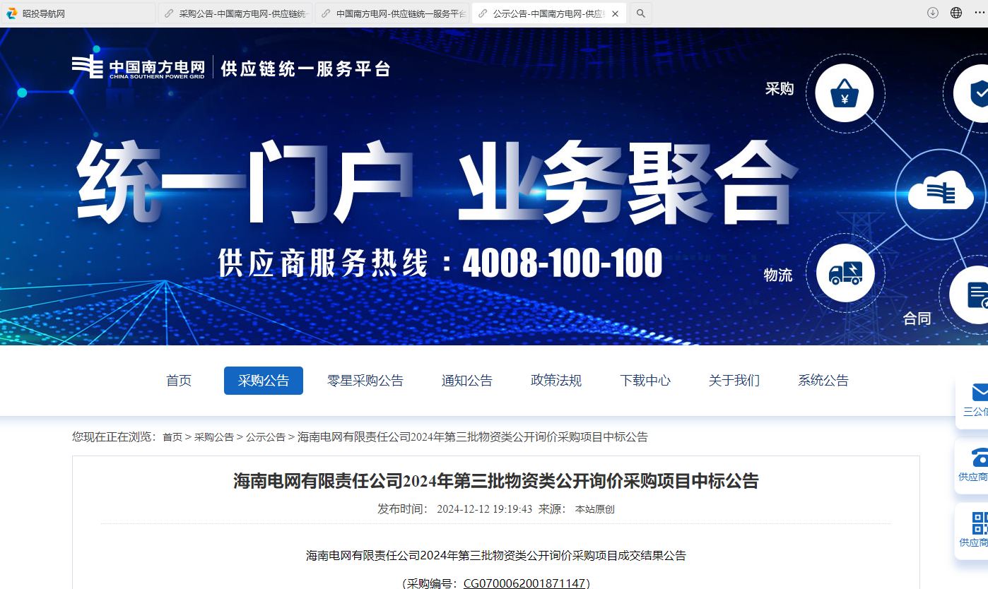 海南電網(wǎng)有限責(zé)任公司2024年第三批物資類公開詢價(jià)采購項(xiàng)目成交結(jié)果公告(采購編號(hào):CG0700062001871147)
