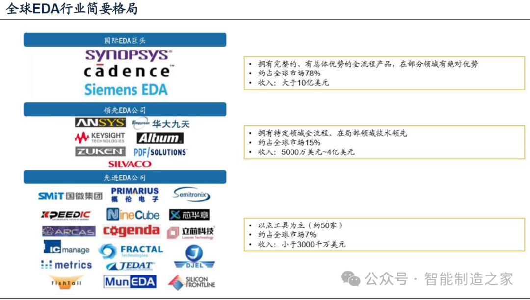 20084月,國務院通過了國家科技重大專項核心電子器件、高端通用芯片及基礎軟件產品(簡稱核高基),為EDA行業提供了強有力的支持和鼓勵。在此背景下,國內EDA本土企業如雨后春筍般涌現。20096月,中國華大集成電路設計集團有限公司的EDA部門獨立,承載了熊貓系統基因的華大九天正式成立。經過十多年的發展,華大九天已成為國內規模最大、產品線最完整、綜合技術實力最強的EDA企業。
