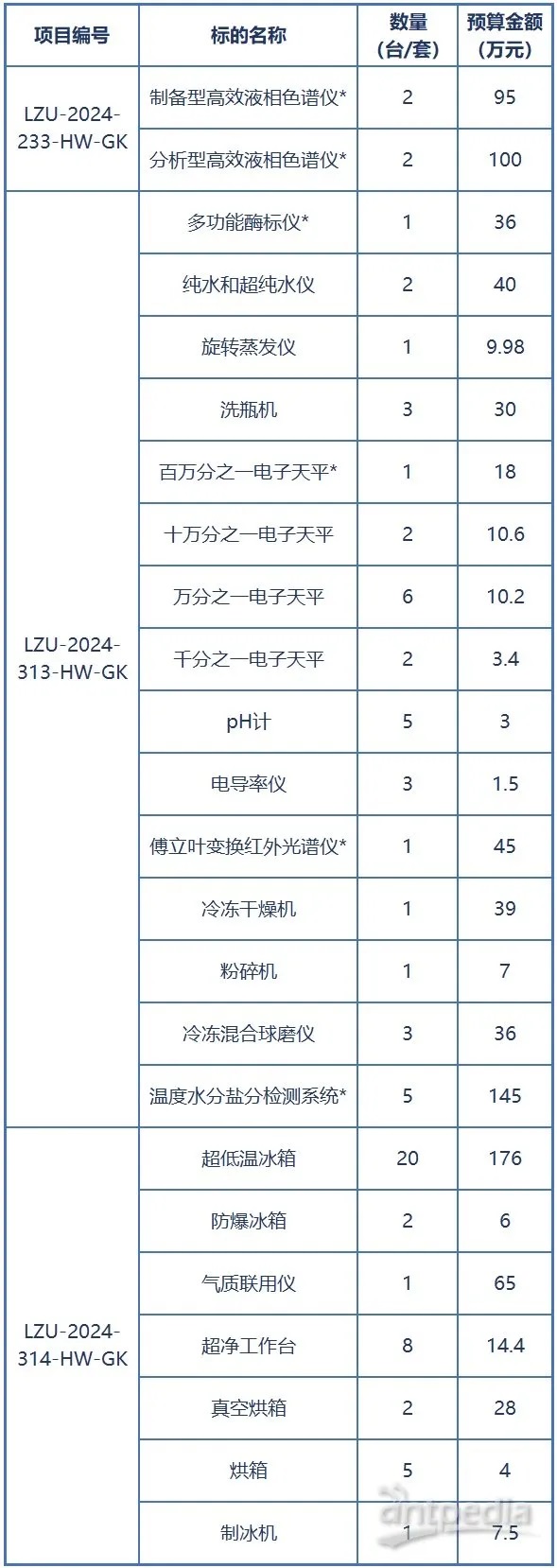 近日,蘭州大學發布了一批招標公告,涉及多個領域和項目。共招標設備包括高效液相色譜儀、酶標儀、電子天平、傅立葉變換紅外光譜儀等,總預算為930.58萬元。以下是詳細信息: