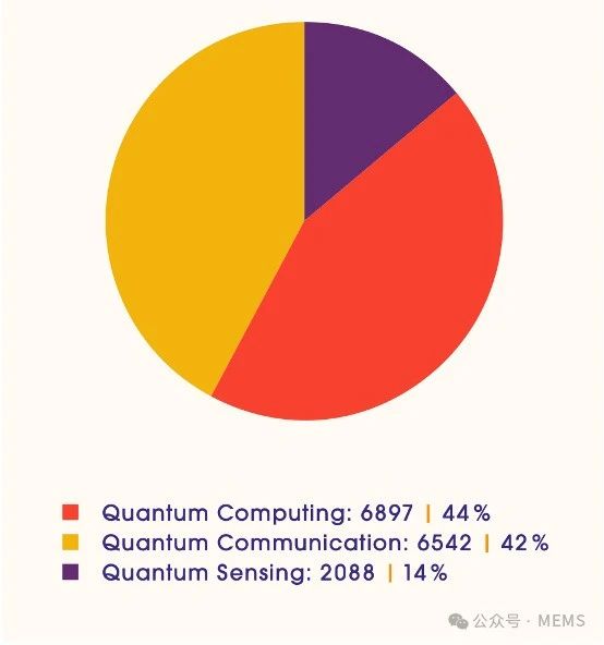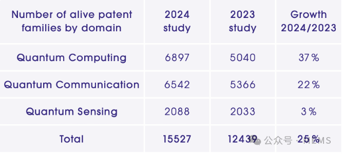 2024年,量子計算和量子通信領域的專利族占比明顯高于量子傳感,三者的占比分別為44%42%14%。從2023年~2024年的增長率來看,量子計算和量子通信領域的專利增長也顯著高于量子傳感領域,三者的增長率分別為37%22%3%。反映了當前全球量子技術領域的發展熱點和重點方向。