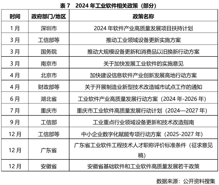 2024年,工信部等多部委、各地方政府進(jìn)一步出臺工業(yè)軟件相關(guān)政策,其中《工業(yè)重點(diǎn)行業(yè)領(lǐng)域設(shè)備更新和技術(shù)改造指南》提出了2027 年完成約 200 萬套工業(yè)軟件和 80 萬臺套工業(yè)操作系統(tǒng)更新?lián)Q代任務(wù)。
