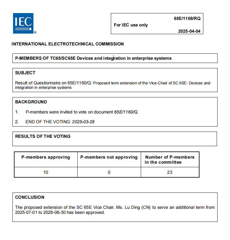 2024年4月,國際電工委員會企業(yè)設備與系統(tǒng)集成分委員會(IEC/SC65E)正式宣布,機械工業(yè)儀器儀表綜合技術(shù)經(jīng)濟研究所(以下簡稱儀綜所)標準與檢測中心主任丁露博士以100%贊成率成功連任IEC/SC65E副主席,任期為2025年7月1日至2028年6月30日。