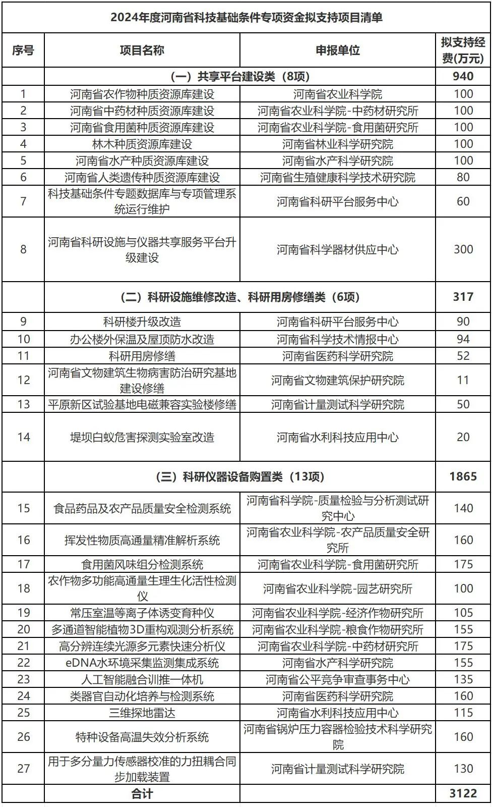 河南省科學(xué)技術(shù)廳對2025年度省科技基礎(chǔ)條件專項資金擬支持項目公示。擬支持項目清單含3類27個項目,擬支持經(jīng)費共計3122萬元。其中,共享平臺建設(shè)類(8項)940萬元,科研設(shè)施維修改造、科研用房修繕類(6項)317萬元,科研儀器設(shè)備購置類(13項)1865萬元。