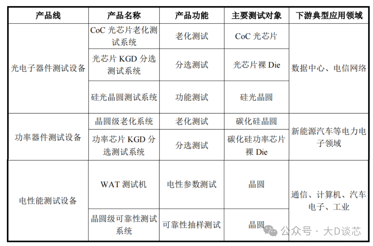 公司半導體測試設備包括主要面向光通信測試的光電子器件測試設備(CoC光芯片老化測試系統、光芯片KGD分選測試系統、硅光晶圓測試系統等),主要面向功率器件測試的功率器件測試設備(晶圓級老化系統、功率芯片KGD分選測試系統等),以及主要面向半導體集成電路測試的電性能測試設備(WAT測試機和晶圓級可靠性測試系統)。