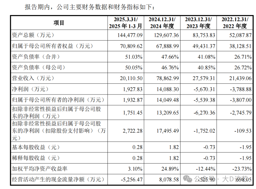 2022年至20253月,公司營業收入分別為2.144億元、2.758億元、7.886億元和2.011億元,歸屬于母公司股東的凈利潤分別為-3807.00萬元、-5539.38萬元、14,049.48萬元和1,932.87萬元。綜合毛利率分別為43.61%60.50%63.63%65.33%