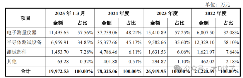 公司產品主要包括電子測量儀器和半導體測試設備,以及配套的測試部件及服務。20251-3月電子測量儀器的營業收入金額為11495.65萬元,占比57.56%;半導體測試設備的營業收入為6959.91萬元,占比34.85%