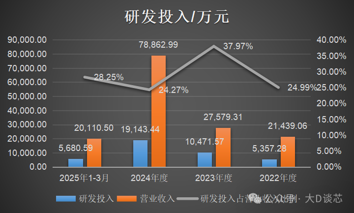 2022年至20253月,公司研發費用金額分別為5,357.28萬元、10,471.57萬元、19,143.44萬元和5,680.59萬元,占營業收入的比例分別為24.99%37.97%24.27%28.25%