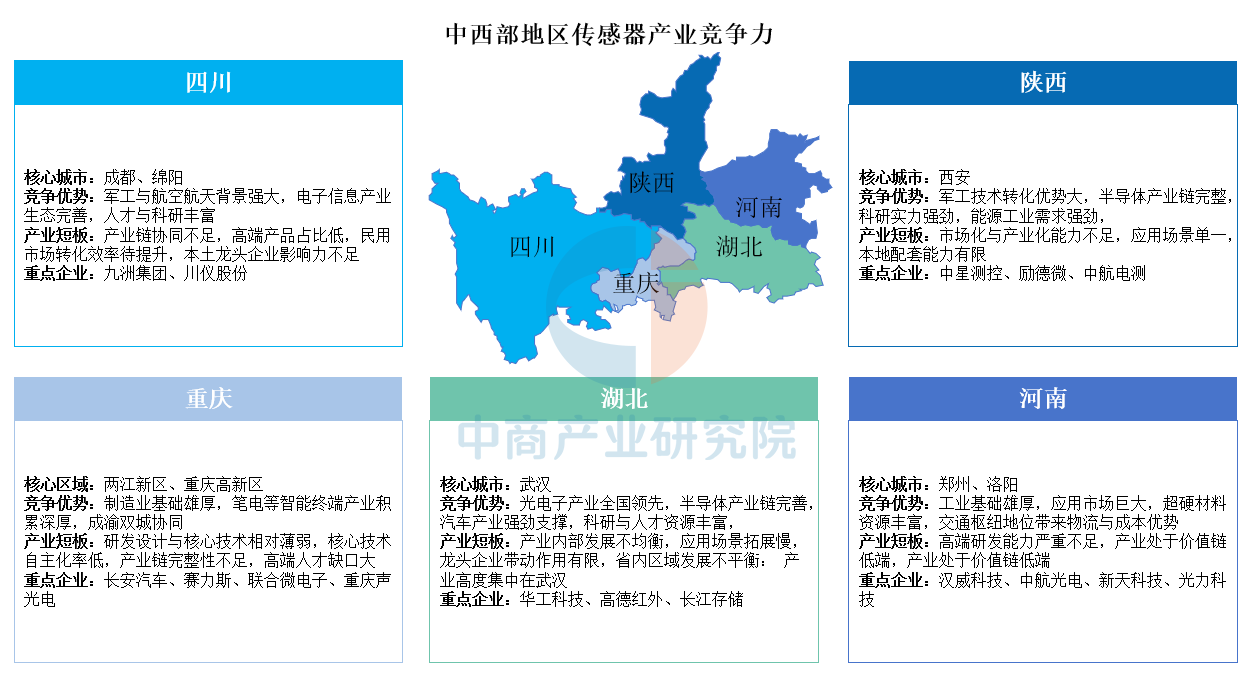 中西部地區傳感器產業依托傳統工業基礎與特色資源,形成多個差異化集聚區。四川依托強大的軍工與航空航天背景及完善的電子信息產業生態,在傳感器領域具備顯著優勢,但面臨產業鏈協同不足、高端產品占比低、民用市場轉化效率待提升及本土龍頭企業影響力較弱等問題;重慶憑借雄厚的制造業基礎、智能終端(如筆電)產業積累及成渝雙城協同優勢出圈,但存在研發設計與核心技術薄弱、自主化率低、產業鏈完整性不足及高端人才缺口大等短板;湖北以光電子產業全國領先、半導體產業鏈完善及汽車產業強勁支撐為特色,但受限于產業內部發展不均衡、應用場景拓展慢、龍頭企業帶動作用有限及省內發展高度集中于武漢等問題;陜西突出軍工技術轉化優勢、完整的半導體產業鏈及強勁的科研實力,但存在市場化與產業化能力不足、應用場景單一、本地配套能力有限等短板;河南則依托工業基礎雄厚、應用市場巨大、超硬材料資源豐富及交通樞紐帶來的物流成本優勢快速發展,但受高端研發能力嚴重不足、產業長期處于價值鏈低端等制約。