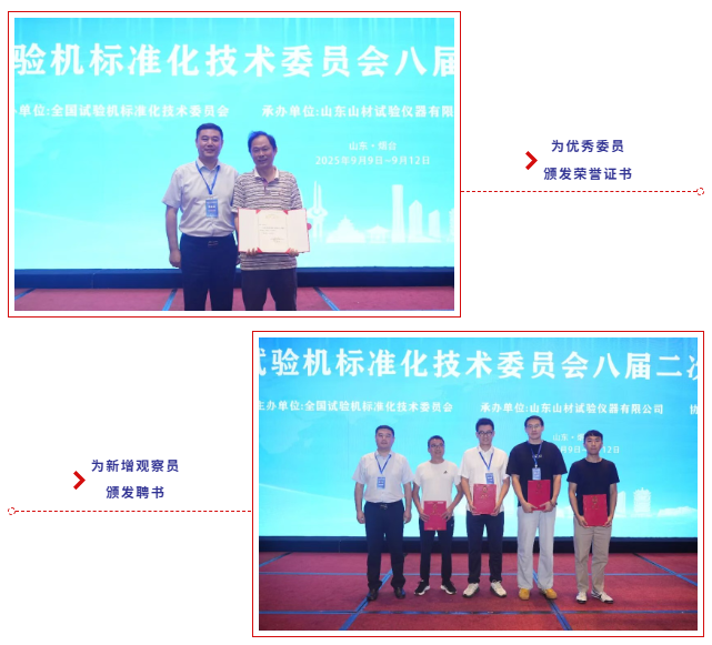 2025 年 9 月 9 日至 12 日,全國試驗機標準化技術委員會(SAC/TC122,以下簡稱 “試標委”)八屆二次會議暨標準審查會在山東省煙臺市成功舉辦。本次會議匯聚行業力量、共話標準發展,來自全國 104 家生產企業、科研院所、大專院校和檢測認證機構的 118 名領導、委員、專家代表、觀察員、顧問、標準起草組成員和相關單位代表參會,共同為試驗機領域標準化建設注入新動能。會議由試標委主辦,山東山材試驗儀器有限公司承辦,濟南鑫光試驗機制造有限公司協辦,試標委秘書長姚丙南與任霞共同主持。