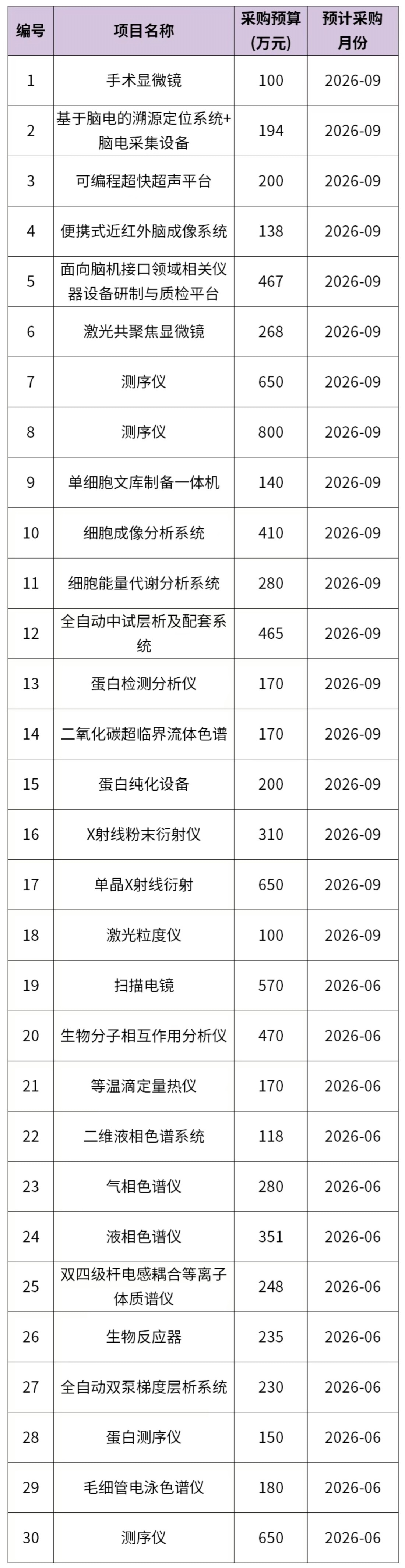 南京醫科大學(本部)2026年2月(第2批)政府采購意向公告發布,計劃于2026年6月、9月購置手術顯微鏡、激光共聚焦顯微鏡、測序儀、蛋白純化設備、掃描電鏡、氣相色譜儀、液相色譜儀、雙四級桿電感耦合等離子體質譜儀等儀器設備,預算總額9364萬元。