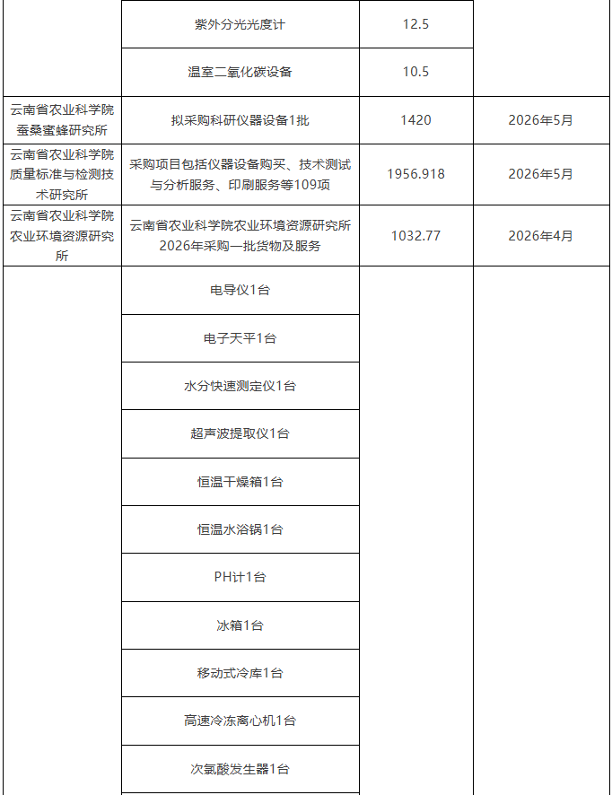 云南省農(nóng)業(yè)科學(xué)院2026年儀器采購意向匯總