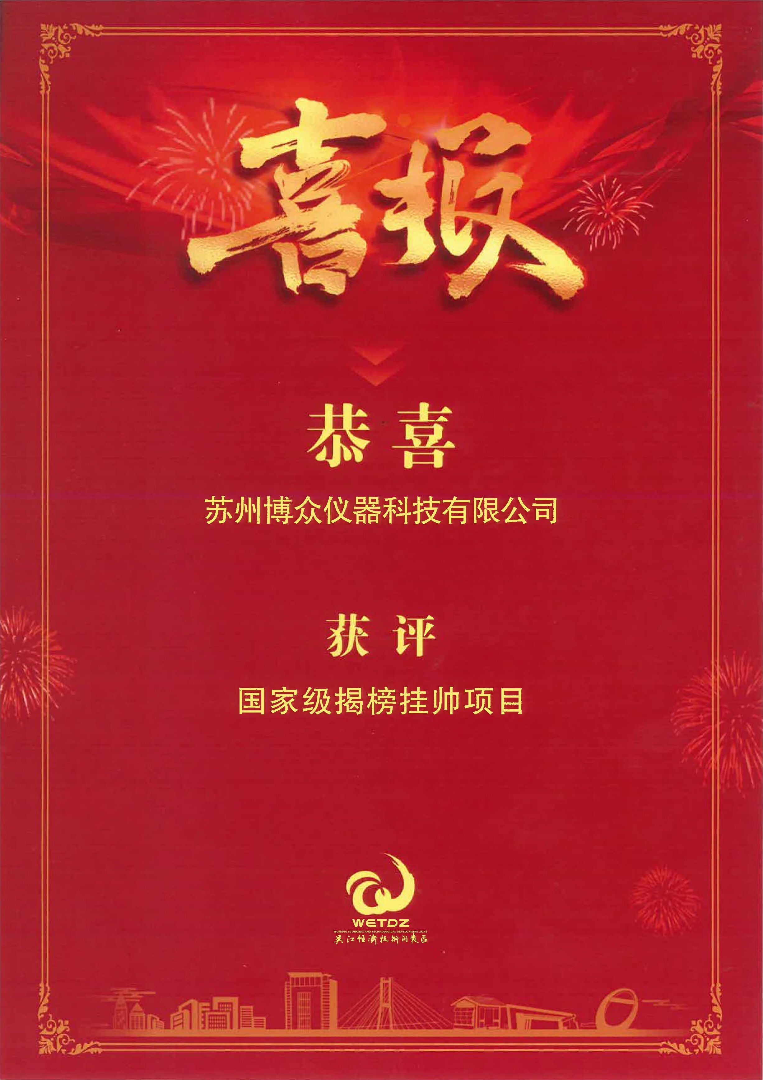 33日,2026 年吳江開發區經濟高質量發展暨一季度“開門紅”動員大會隆重召開。作為“十五五”開局之年的關鍵部署會議,本次大會聚焦產業攻堅與企業賦能,博眾儀器受邀參會,并憑借國家級揭榜掛帥項目獲現場表彰,成為大會亮點之一。區委書記孫建江出席會議并發表重要講話。