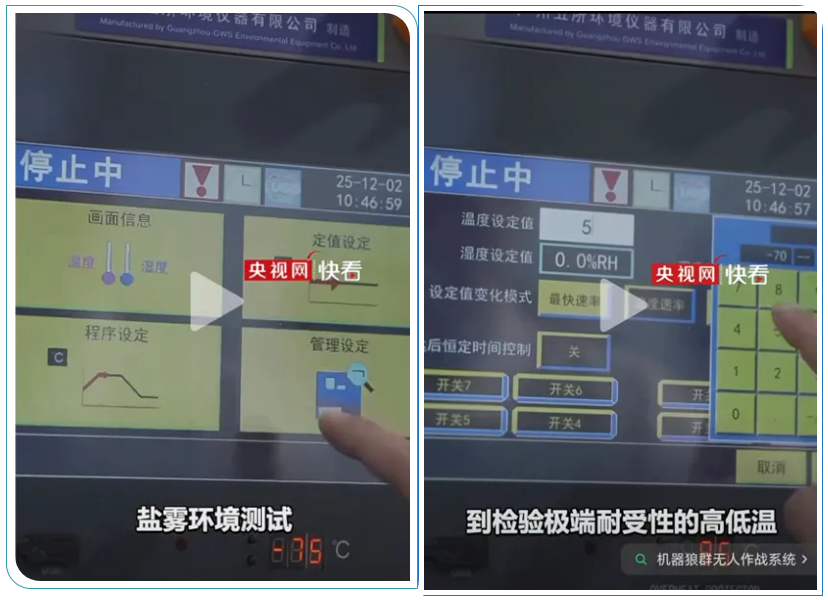 報道畫面中,廣五所公司多系列環(huán)境試驗(yàn)設(shè)備協(xié)同發(fā)力:步入式試驗(yàn)箱可對“機(jī)器狼”本體開展極端耐受性高低溫環(huán)境試驗(yàn),模擬極寒、高溫等復(fù)雜工況;快速溫度變化環(huán)境試驗(yàn)箱則為關(guān)節(jié)電機(jī)等核心部件提供高強(qiáng)度的溫度沖擊驗(yàn)證,精準(zhǔn)考核部件在極端溫度交變下的性能穩(wěn)定性;同時,我司自主研發(fā)的設(shè)備控制器操作界面清晰呈現(xiàn),溫度、濕度、速率、恒定時間等關(guān)鍵環(huán)境參數(shù)實(shí)時可控,確保試驗(yàn)過程精準(zhǔn)可追溯。從核心部件的精細(xì)化測試到整機(jī)系統(tǒng)的極端環(huán)境驗(yàn)證,廣五所公司設(shè)備全面助力“機(jī)器狼”完成了全鏈條可靠性考核,為打造更智能、更強(qiáng)健、更具實(shí)戰(zhàn)本領(lǐng)的機(jī)器狼批量化生產(chǎn)提供了關(guān)鍵數(shù)據(jù)支撐。