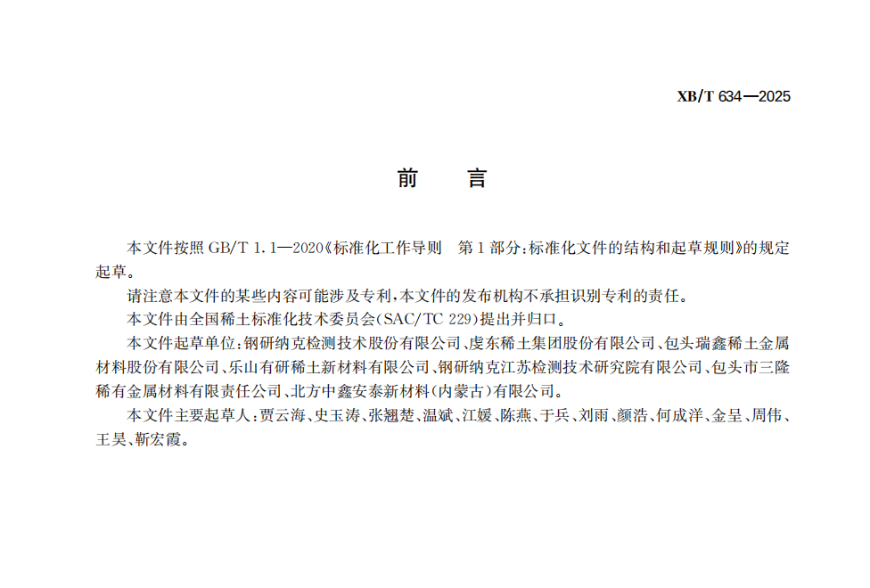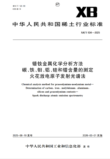 由鋼研納克檢測技術股份有限公司(以下簡稱“鋼研納克”)牽頭,鋼研納克江蘇檢測技術研究院有限公司參與,聯合多家行業重點稀土金屬生產企業共同起草的稀土行業標準《XB/T 634-2025 鐠釹金屬化學分析方法 碳、鐵、鉬、鋁、硅和鐠含量的測定 火花放電原子發射光譜法》已于2025819日發布,于202631日起正式實施。作為稀土行業首個采用火花光譜分析方法的標準,它進一步完善了鐠釹金屬化學成分檢測方法體系,也體現了鋼研納克及鋼研納克江蘇檢測技術研究院有限公司在稀土檢測技術研發與標準化建設方面的持續積累。