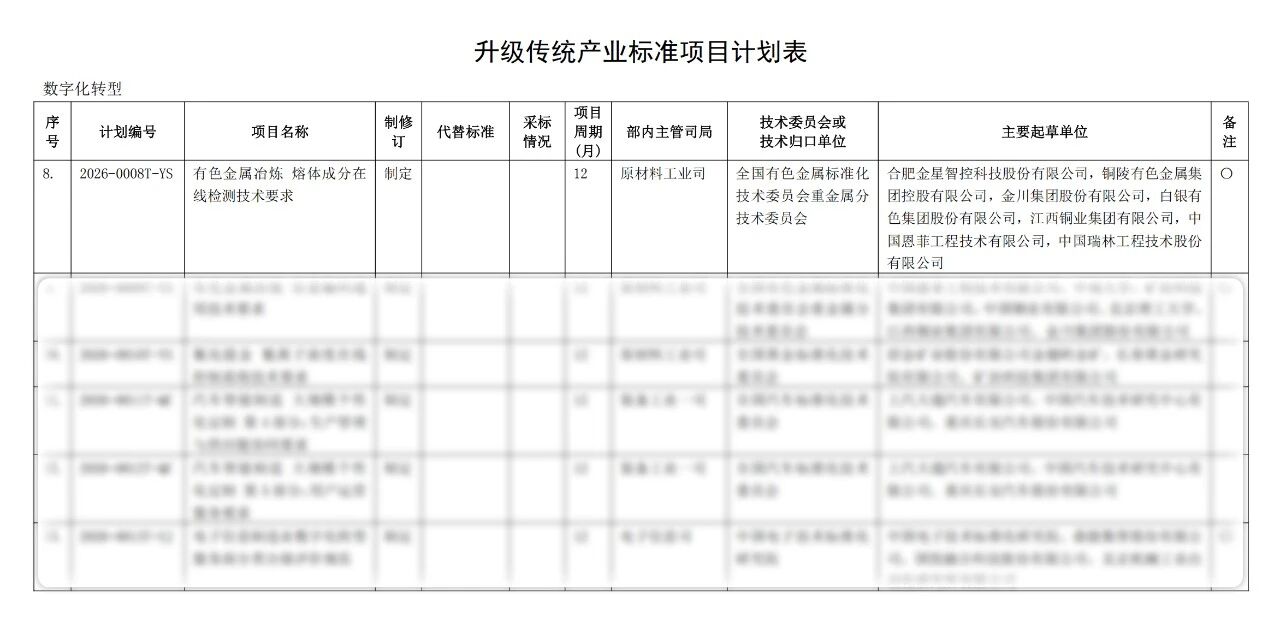 近日,國家工業(yè)和信息化部正式發(fā)布《2026年第一批行業(yè)標準制修訂和外文版項目計劃》,由金星智控牽頭申報的《有色金屬冶煉熔體成分在線檢測技術要求》(計劃編號:2026-0008T-YS)行業(yè)標準獲批立項。這標志著我國有色金屬冶煉熔體成分在線檢測領域即將迎來首項行業(yè)技術規(guī)范,將有力推動行業(yè)從取樣離線化驗室檢測邁向在線原位檢測。